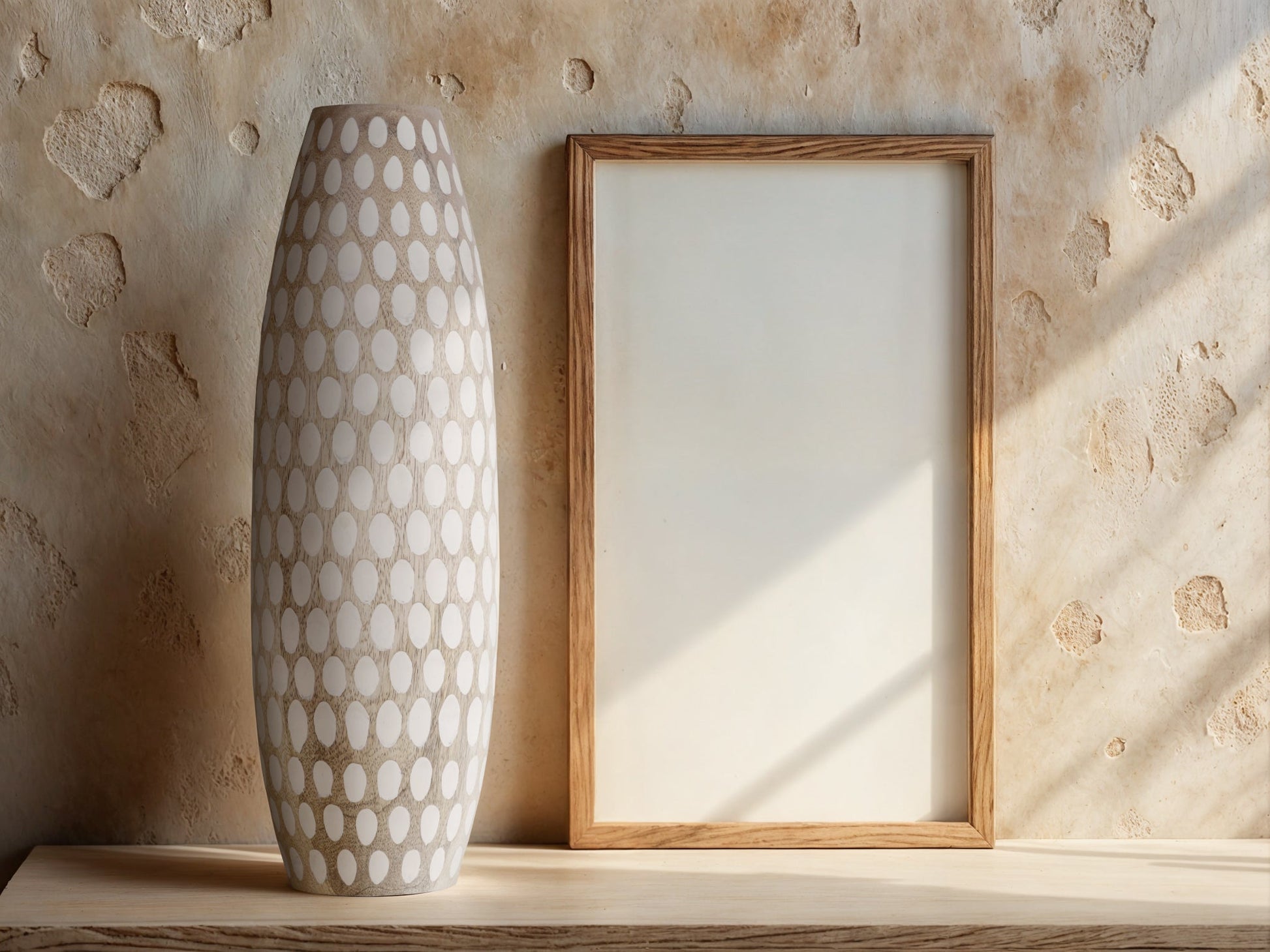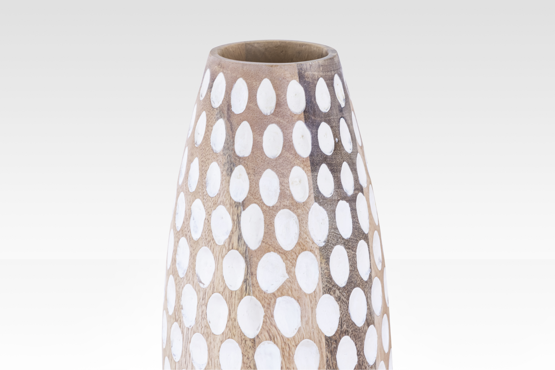 Rustic charm, artisan elegance. The Serenia Hand-Carved Wooden Vase brings a touch of natural sophistication to your home décor. Meticulously hand-carved from solid wood, this elongated vase features an intricate pattern of white oval dots that highlights its artisanal craftsmanship and timeless beauty.