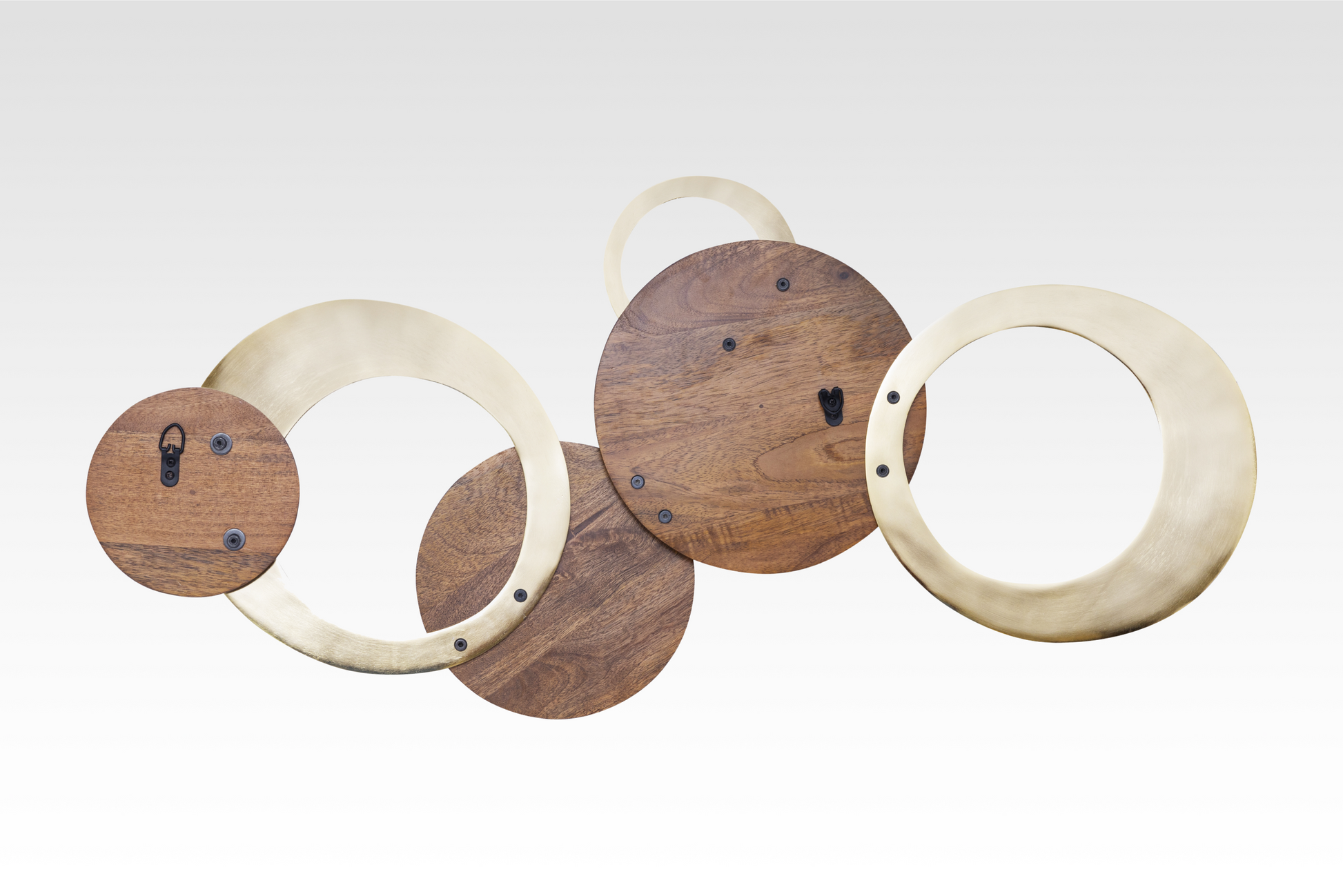 Modern artistry, timeless balance. The Chakra Wall Decor is a striking piece of metal artwork designed to blend elegance, geometry, and contemporary style. Featuring a dynamic arrangement of circular shapes, it beautifully combines warm wood tones with gold metal accents to create an eye-catching contrast that radiates sophistication.