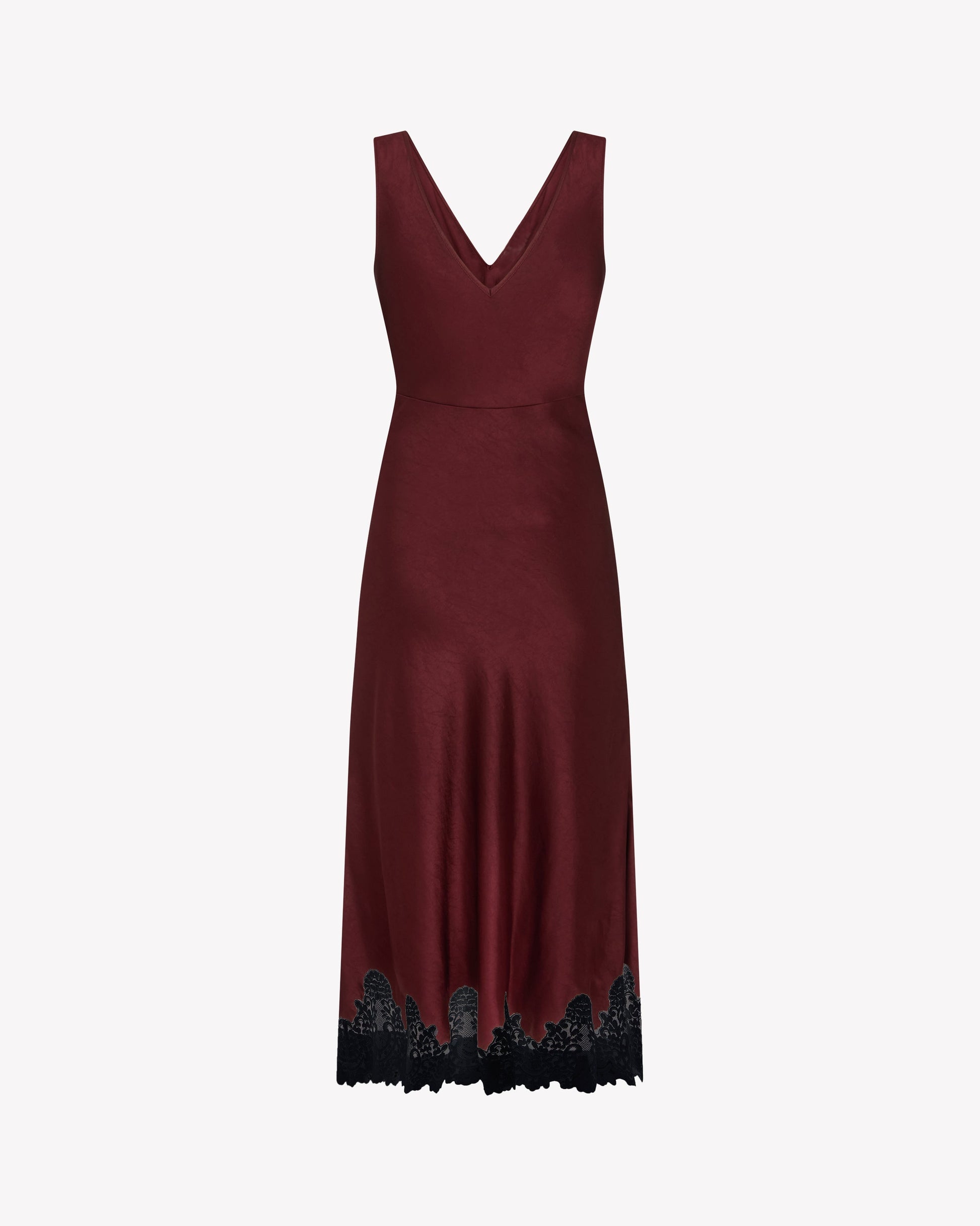 Elegant and effortlessly alluring, the Bordeaux Satin Midi Dress is a statement of refined femininity. Crafted in a deep burgundy satin, it features a graceful V-neckline and a bias-cut silhouette that softly hugs the body. The lace-trimmed hem adds a touch of romance, making this piece the perfect blend of sensuality and sophistication.