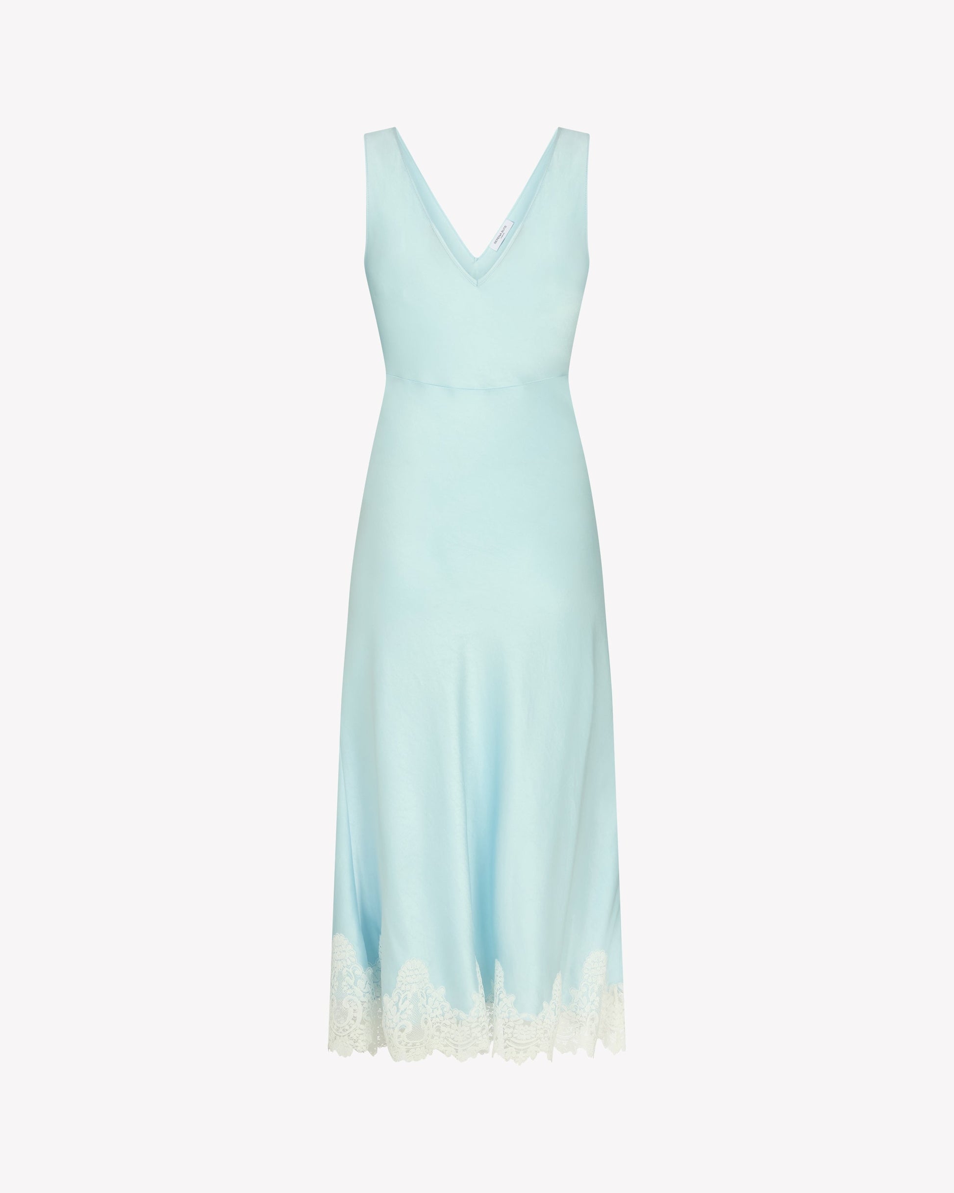 Breezy, feminine, and effortlessly polished. The Celeste Lace Midi Dress skims the body with a soft bias cut and finishes in a delicate scalloped lace hem. Rendered in a pale-sky blue satin with a gentle sheen, it moves beautifully and flatters from every angle.