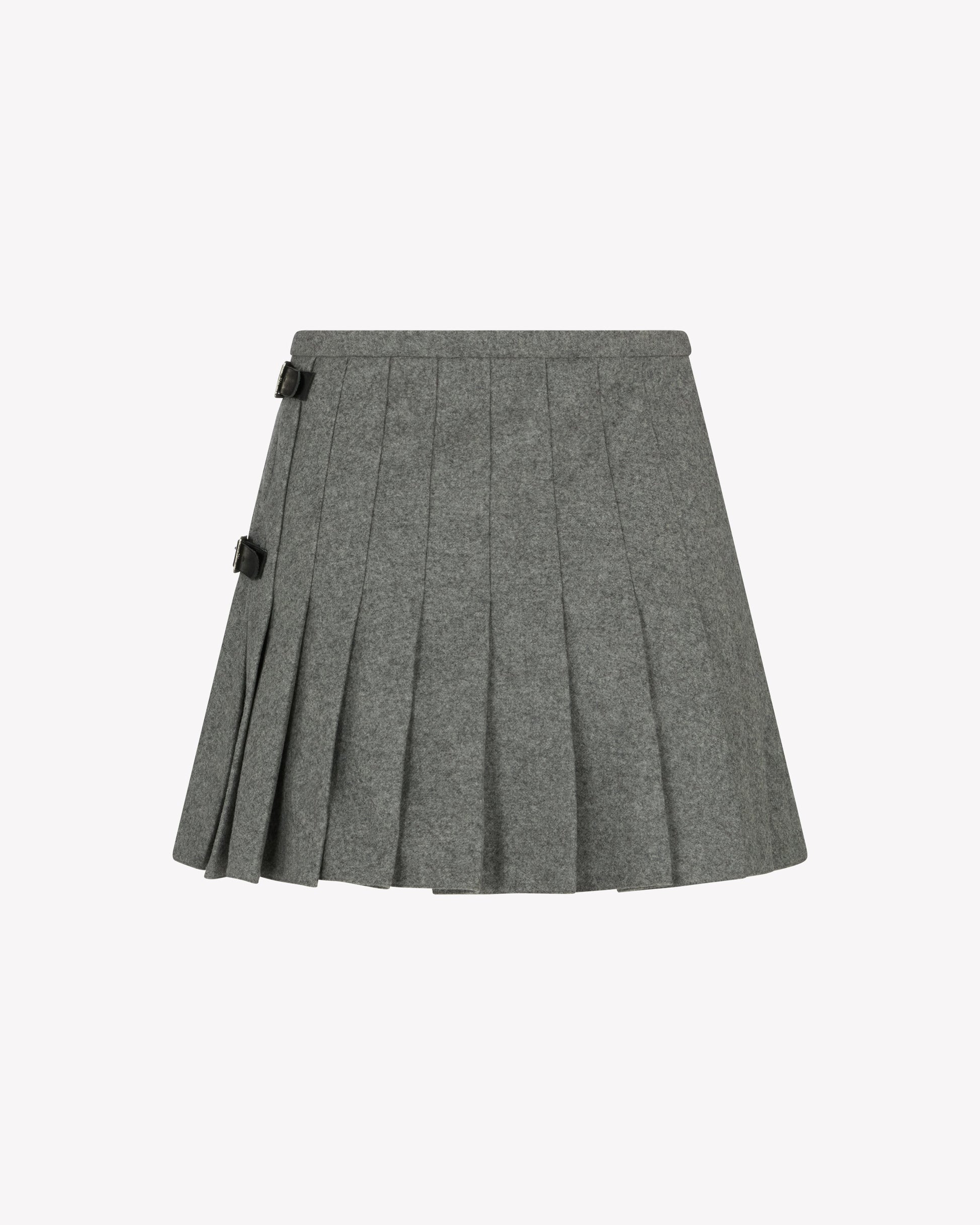 - Kilt-inspired construction — adjustable side buckles and sharp knife pleats