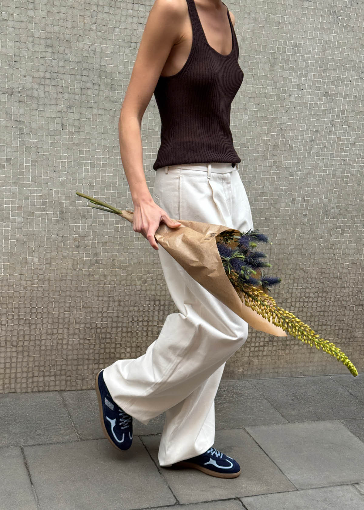 The Tb.490 sneaker is crafted entirely from navy blue suede with light blue suede trims. Matching laces with black stripes add subtle contrast. The low-top silhouette sits on brown rubber soles, featuring highlighted stitching along the profile and an embossed logo on the tongue and sides.